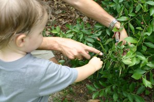 We were lucky that Ms. Carla was over there with I assume her daughter and mother high up in the blueberry bushes that lined the driveway leading to the house. Approaching from the back of the house, we made our presence know and we were once again greeted with that good ole’ Southern hospitality. Carla, as it turns out, went to school with our friend’s older brother and had not seen our friend in many years so a few brief introductions had to be made. Now I need to tell you that Baby Boy loves him some fruit straight off the bush, vine, tree- whatever…, heck, he doesn’t care if it’s on the ground covered in dirt. We had found his Heaven on earth right there in North Georgia off Big A Road. We all enjoyed picking and eating right off the bushes, and even purchased several quarts that Carla and company had already picked.