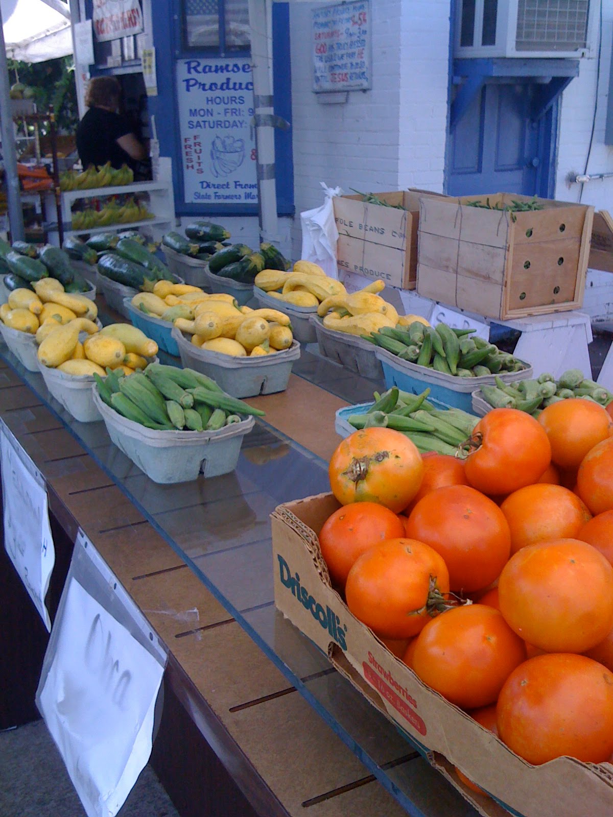 One of my favorite places to go in our town is a local produce stand that, luckily, is now open year round. It sits on a corner and occupies a space that used to be a filling station. I have enjoyed watching this small business grown over the last few years. I love the fact that I can go purchase wonderful, fresh, local produce for next to nothing when compared to super market prices! Today, I got to witness one of the farmers coming in to try and sell his produce to Mr. Ramsey, the proprietor. The farmer had a crate of really pretty tomatoes that he was trying to sell. Mr. Ramsey gave them a VERY thorough once over before purchasing the crate’s contents. It was an interesting deal to watch as I was paying for my loot. I think both men wanted to make sure the other one knew what a “good deal” they were getting. I’m almost certain they thought I was eaves-dropping, but I really couldn’t help it!