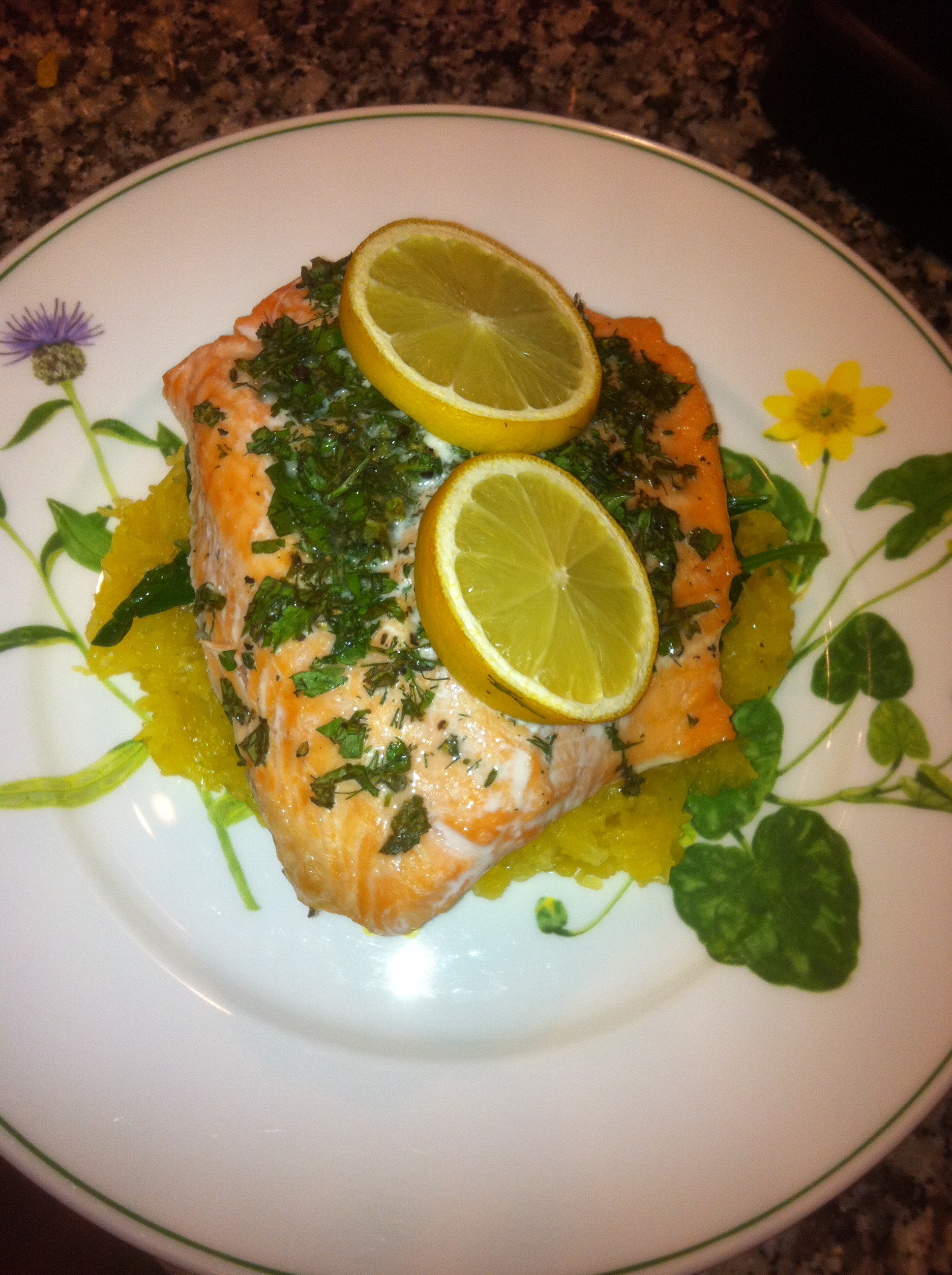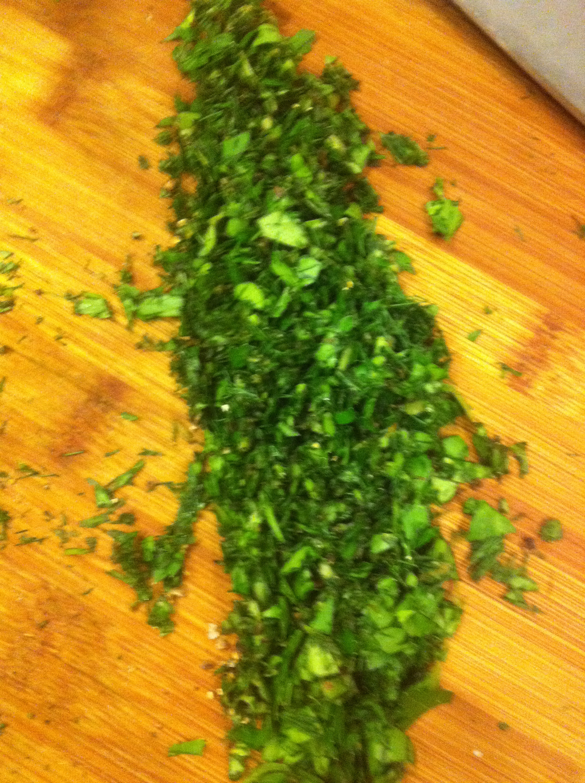 So first, based on my current fav salmon recipe, I chopped up a variety of herbs. ( I used thyme, basil, Italian parsley, and dill)