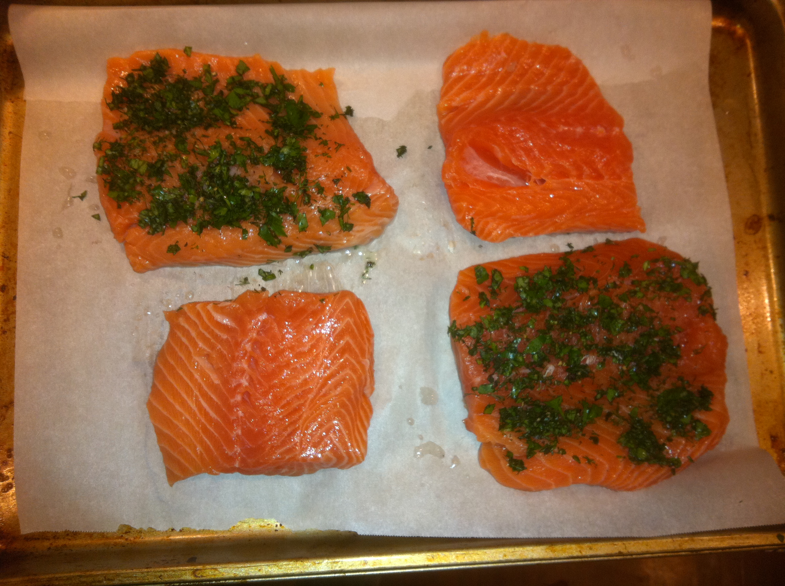 Then, I put the herbs all over the salmon filets san the ones for the kids- no grass on their fish!