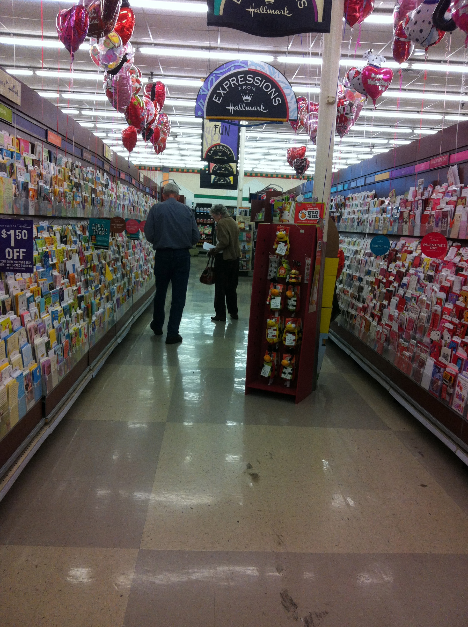 Well, actually, this is NOT what I saw first, but once I was able to grab my phone (how weird does that sound) and get a quick shot without intruding. When I started down this aisle, I saw this couple- on opposite sides of the Valentine section picking out cards. Trying to find the perfect card for each person to say how much they loved them. I wondered if they were picking out cards to give each other, their children, their grandchildren? I do know that they were being very thoughtful about the process- carefully looking at the selection and smiling at those that would make it into their basket, shaking their heads at all the others. I tried to be inconspicuous as I watched them so they wouldn’t know someone was butting in on their “Valentining”. By the time I made it down the aisle and turned around, this is what I saw. She looked back and smiled at him as he walked towards her with his cards. They were done and heading out. Happy with their choices.