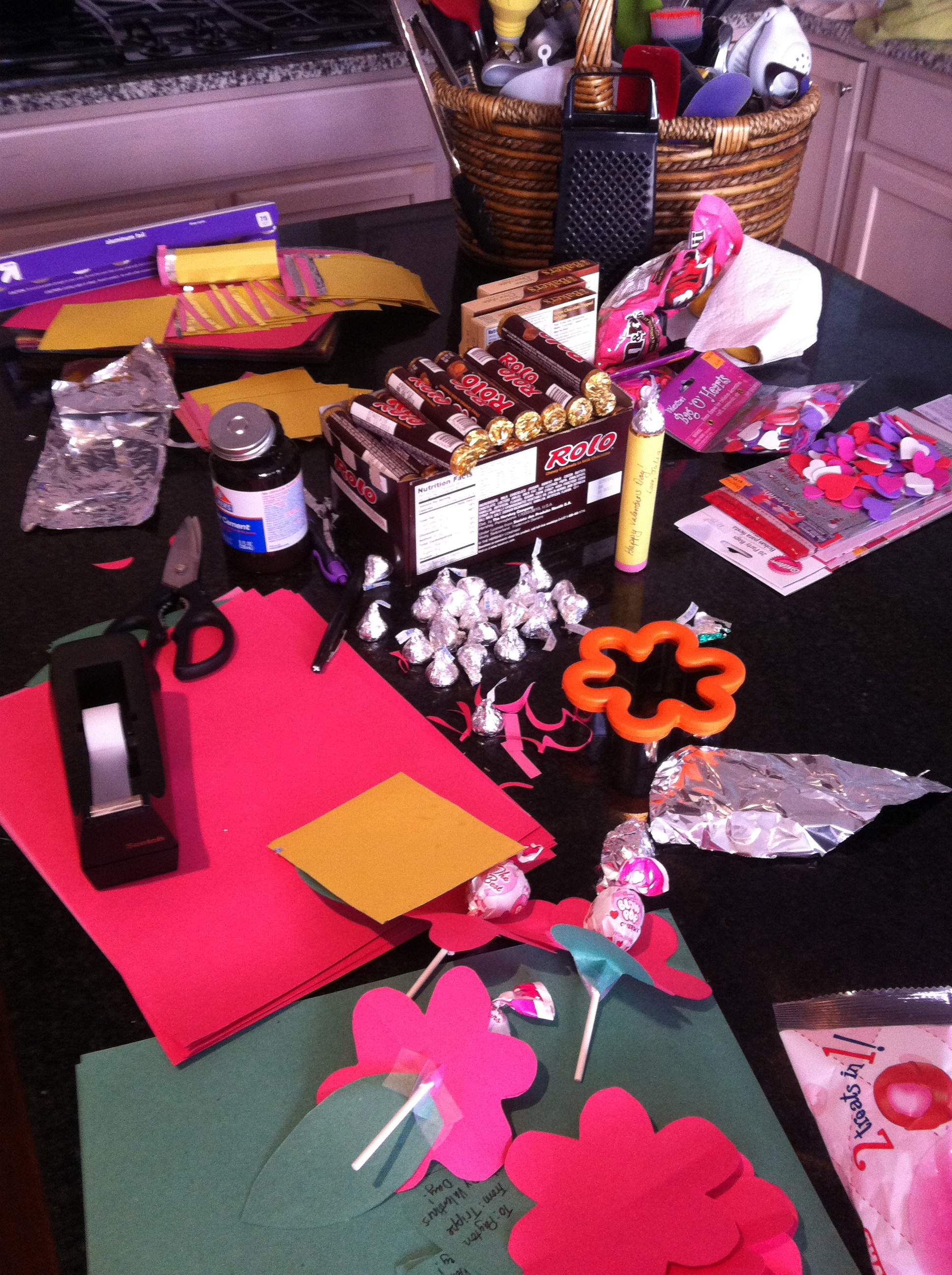 I started my Valentine’s prepping early this year, ( I know, it still shocks me even now.) buying my kids goodies to make (hang on to your seat) HOMEMADE Valentines for their school chums! Thank you ‘crack’terest.com. It was a project that took a few hours , but they all got done and sent on their merry little way Valentine’s morning.